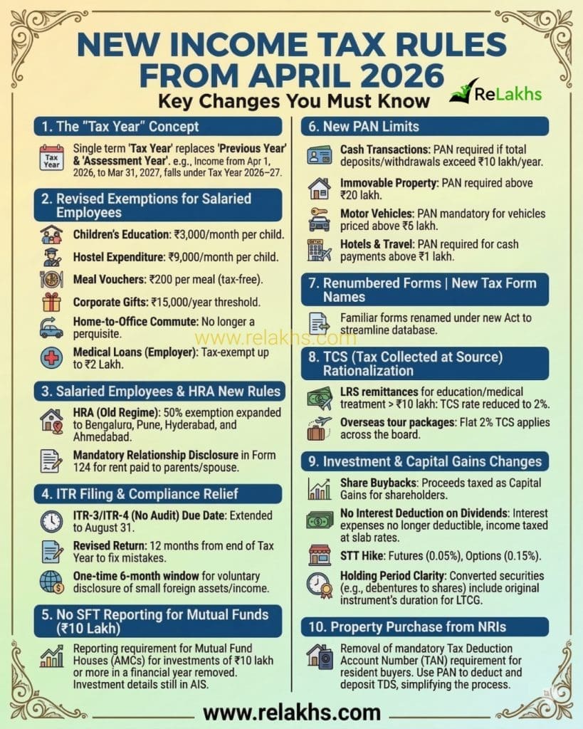 The brand new earnings tax guidelines efficient from April 1, 2026 introduce a simplified tax system underneath the Revenue Tax Act, 2025. Key modifications embrace the alternative of Evaluation 12 months with Tax 12 months, revised compliance construction, up to date PAN and reporting limits, simplified TDS/TCS provisions, and clearer capital features guidelines. Whereas tax slabs stay largely unchanged, the main target is on improved transparency, simpler submitting, and stricter reporting.